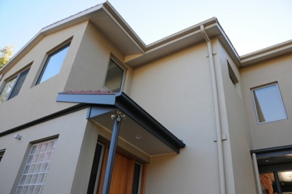 The owners of this place had a real vision to transform their living space, and they committed to it for the long haul. Paul & Jenny were very careful when selecting their cladding: they asked us for addresses so that they could see and touch completed works for themselves; although, aesthetic wasn’t all they were thinking of. We talked about R-Value, energy consumption, acoustics, impact resistance… In the end, they turned a typical cold and dark double-brick duplex of the inner suburbs of Canberra, into a light groovy thermal fortress. 100mm panels were used on all first floor extensions, and deep timber frame was erected to give enough room for an insulative void between internal bats and the external cladding. Wide openings and high ceiling wasn’t going to make this a cold habitat! In conjunction with great insulation, bay windows were strategically oriented to collect most of the northern sun, which was stored within the mass of their polished concrete floor. The upper floor (cladded with the Masterwall) was rendered with 2 base-coats and 1 tinted texture, while the rest of the walls were finished smooth and then lightly sponged to create contrast between the 2 levels.